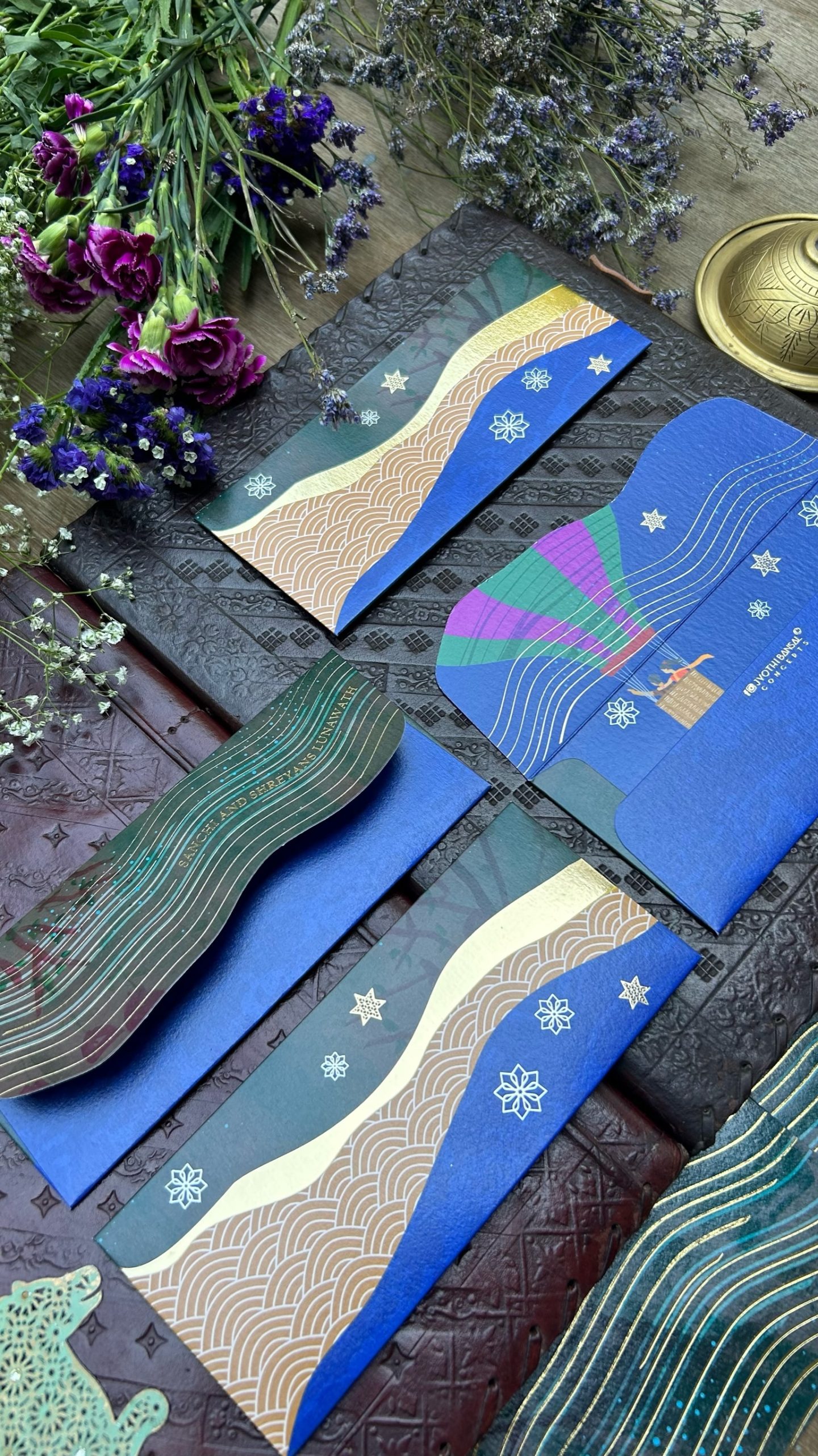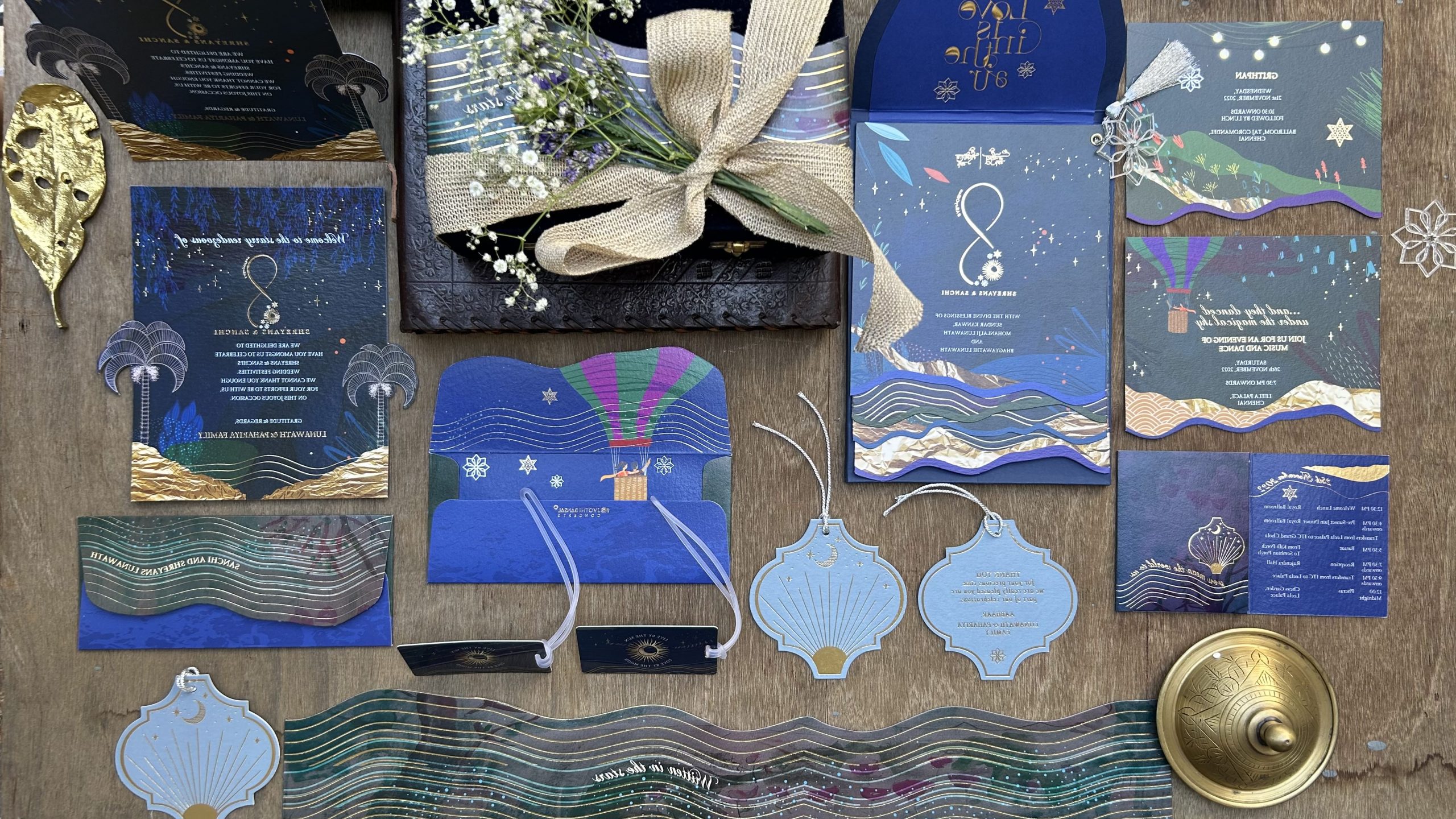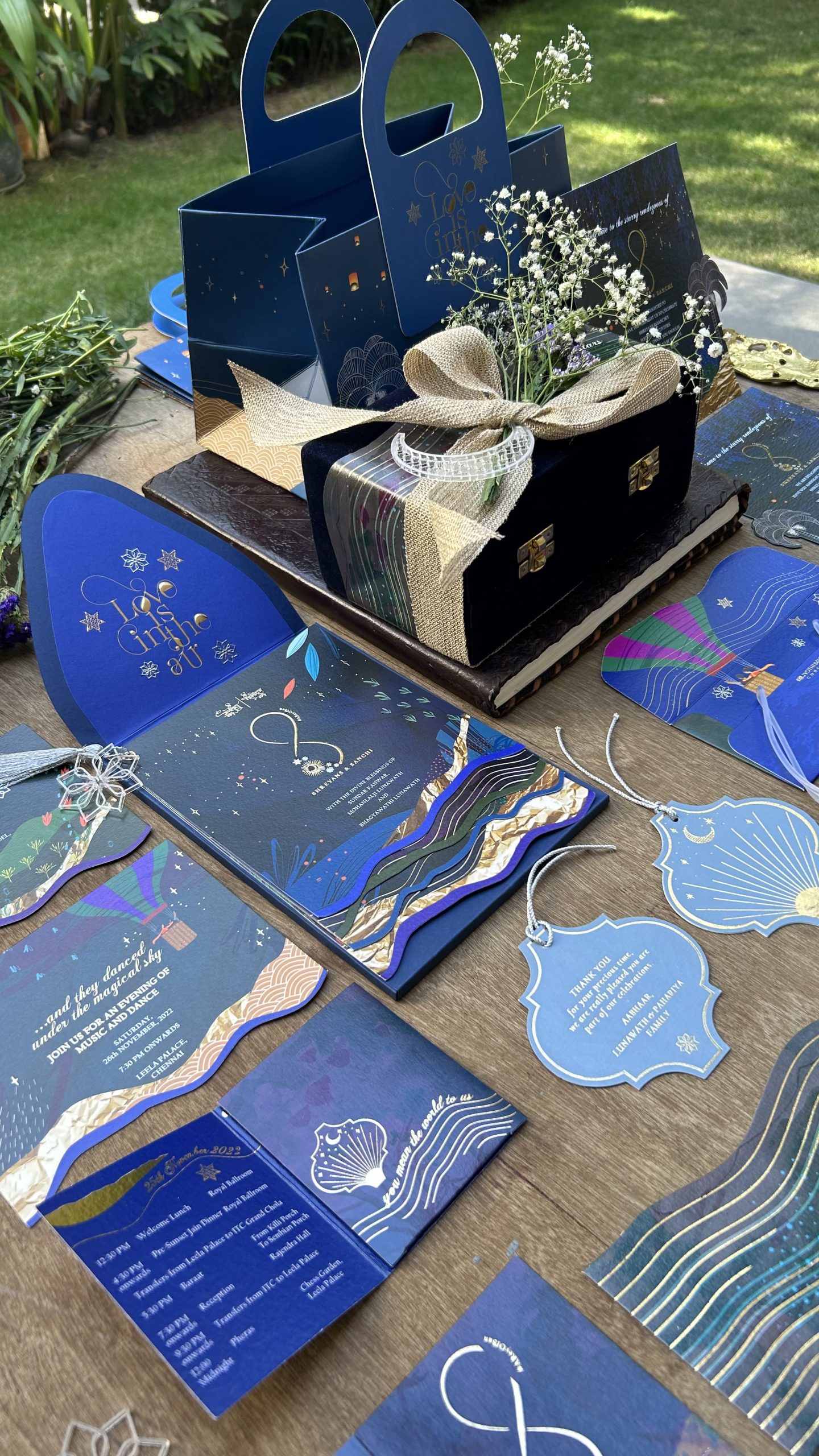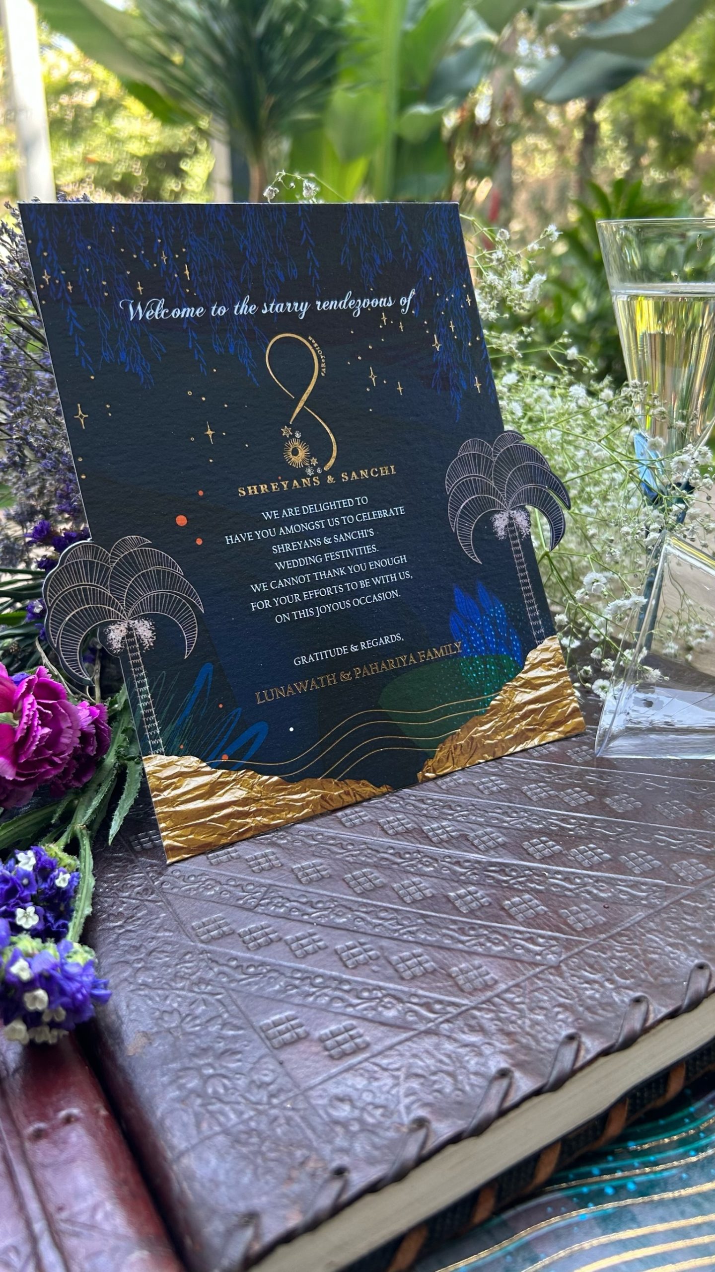 Inspired by the infinite beauty of the night sky, our design features deep blues and purples, evoking the mystery and wonder of the universe. Intricate illustrations of stars, moons, and galaxies dance across the invitation, symbolizing the infinite love and possibilities that Shreyans and Sanchi share.