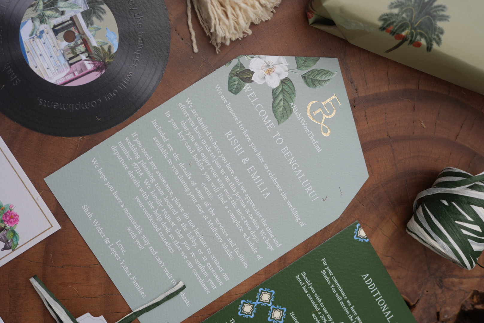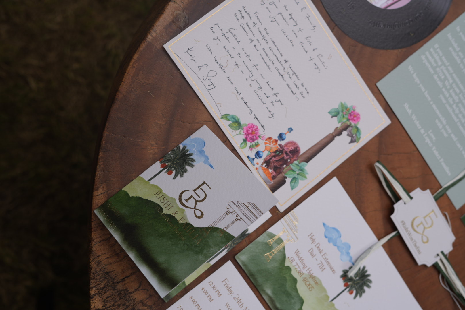 Rishi and Emilia’s wedding invitation is a melodic celebration of their love, set against the serene backdrop of a traditional Amitarasa venue. Inspired by vintage music records, this unique design harmonizes the rhythm of their relationship with the beauty of their special day.