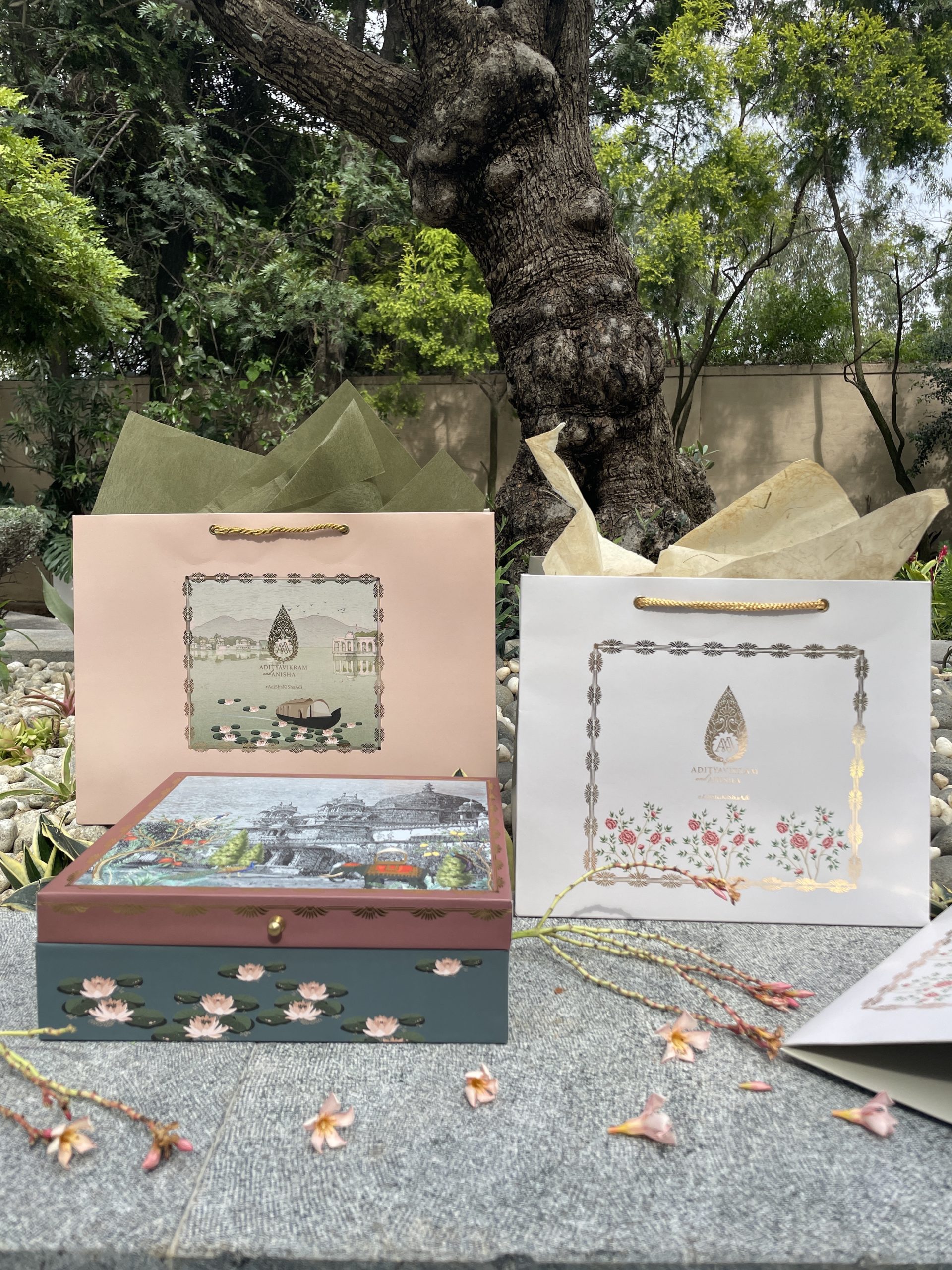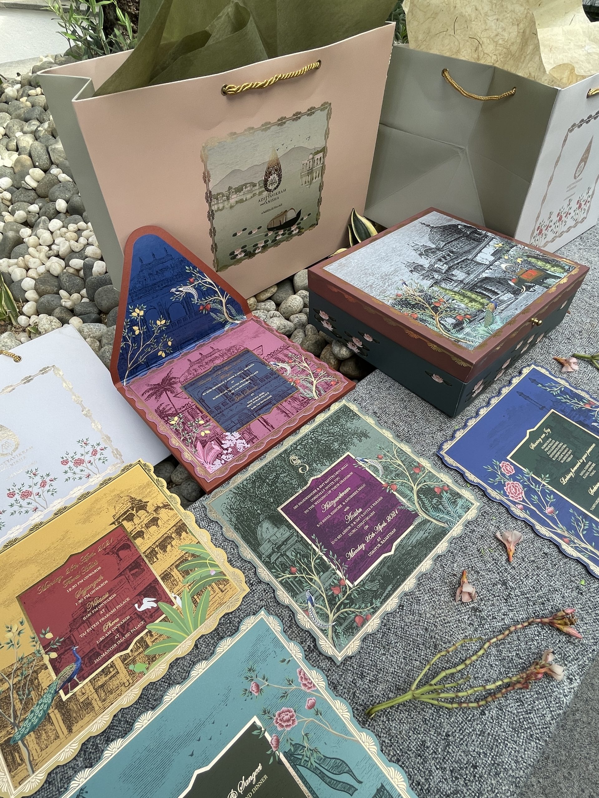Introducing our exquisite wedding invitation, inspired by the breathtaking architecture and regal heritage of India’s City of Lakes. This stunning design combines intricate elements and luxurious textures, transporting your guests to the majestic world of Udaipur’s palaces and forts.